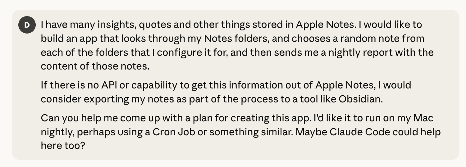 You could literally tell Claude Code: "Build me a Python script that reads random markdown files from configured folders and emails them to me" and iterate from there.