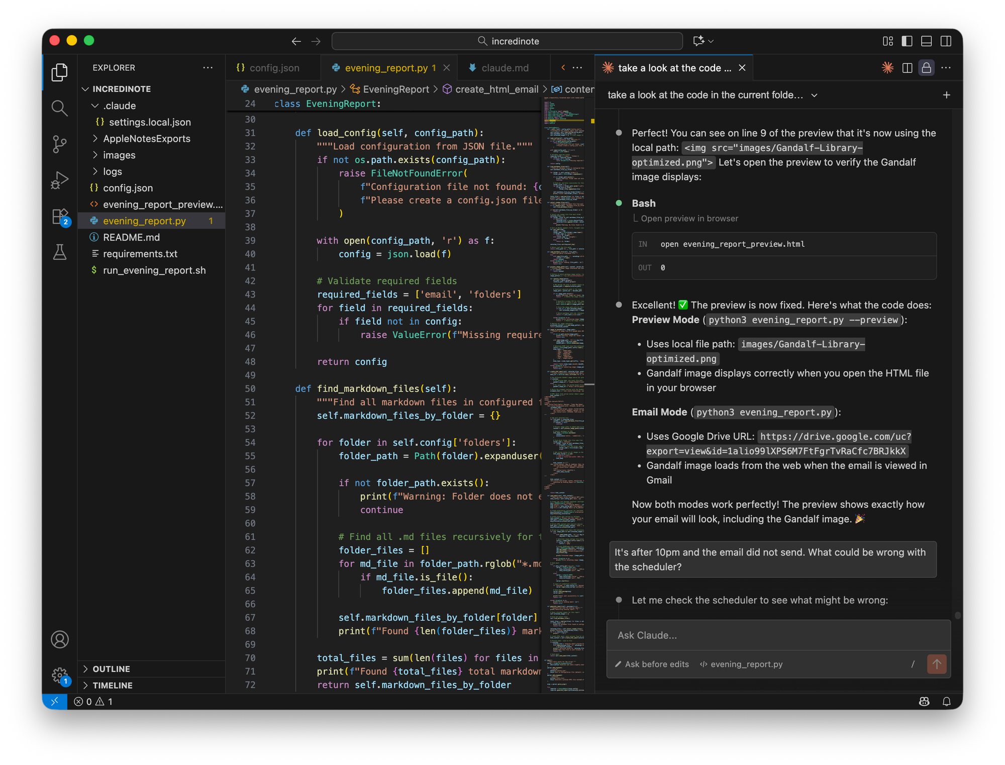 My first experience with Claude Code was impressive. It came up with a folder structure, an initial format for the "Evening Report" and even a preview capability so I could see what the report looks like during development before sending any emails. It was easy to review the project structure and the code since I set up Claude Code inside of VS Code.