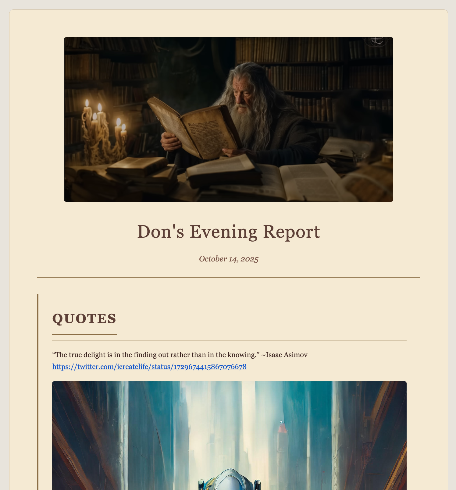 I would love to get an "Evening Report" every night with my favorite quotes and insights before I go to bed. Then instead of getting stressed and anxious scrolling through Twitter I can review positive, inspiring things before I go to sleep.